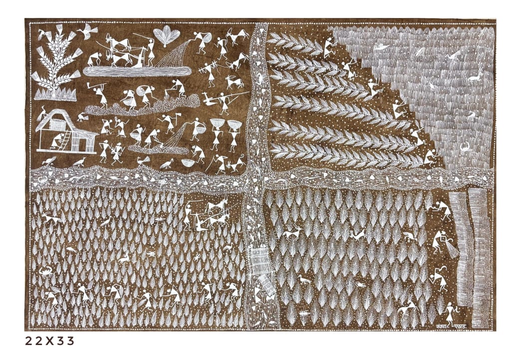 This exquisite piece of Folk Art, titled “Chaval Ki Kheti”, is a captivating work created by the talented artist, Sanjay Panhad. This painting captures the spirit and tradition of Folk Art through its intricate detailing and vibrant use of color, making it a powerful cultural statement.