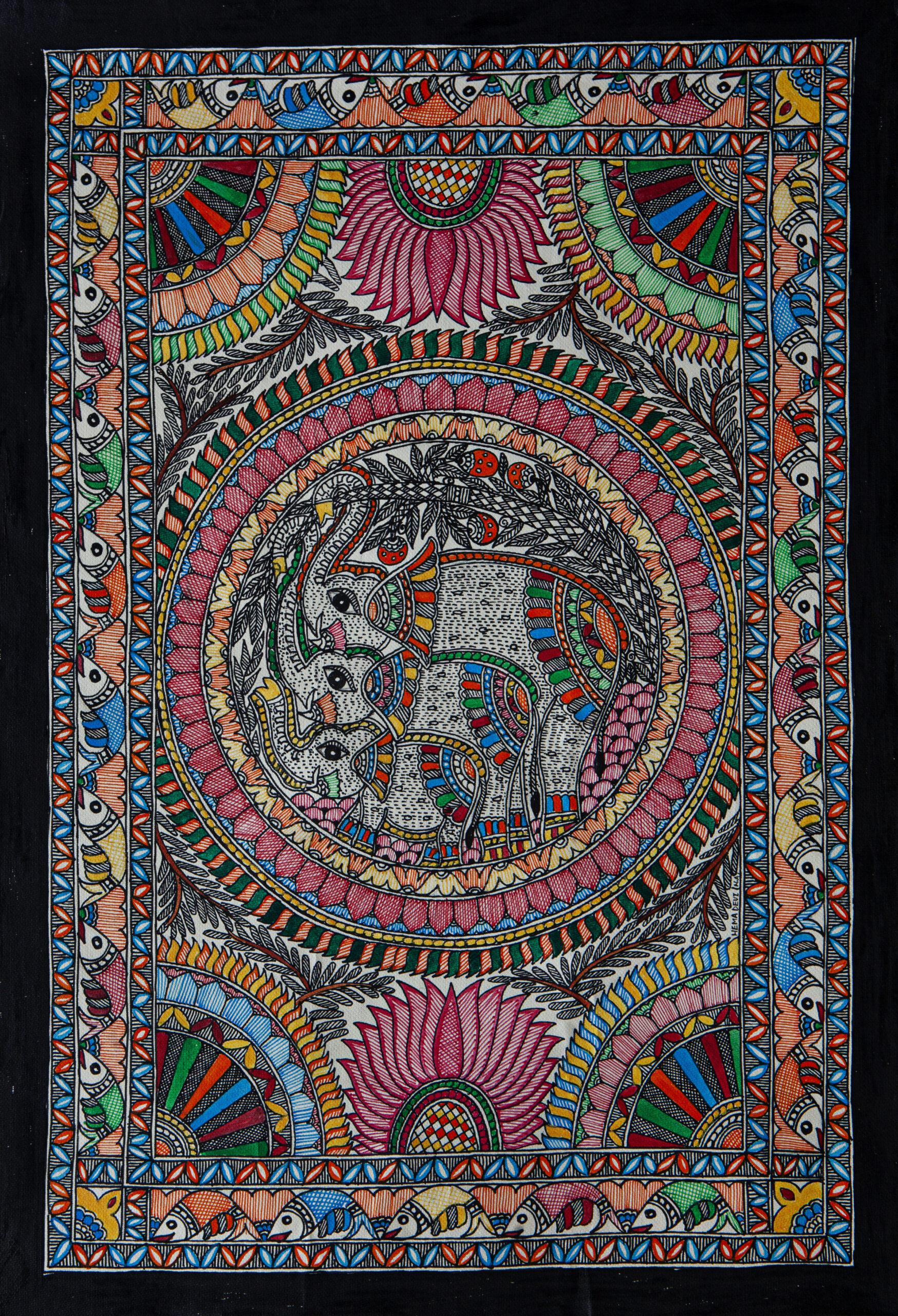 This exquisite piece of Folk Art, titled “Group of Elephant in Jungle”, is a captivating work created by the talented artist, Hema Devi. This painting captures the spirit and tradition of Folk Art through its intricate detailing and vibrant use of color.