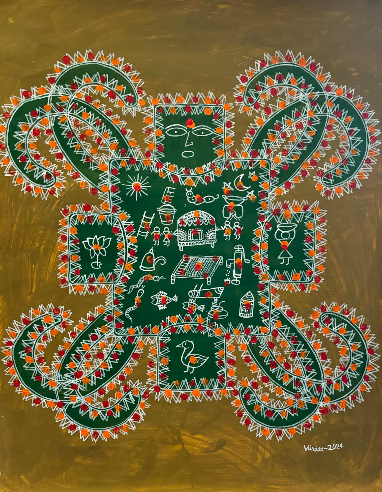 This exquisite piece of Folk Art, titled “Pidia Mai”, is a captivating work created by the talented artist, Vinita Kumari. This painting captures the spirit and tradition of Folk Art through its intricate detailing and vibrant use of color, making it a powerful cultural statement.