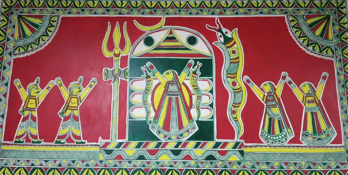 This exquisite piece of Folk Art, titled “Shiv Mansha”, is a captivating work created by the talented artist, Anukriti Kumari. This painting captures the spirit and tradition of Folk Art through its intricate detailing and vibrant use of color.