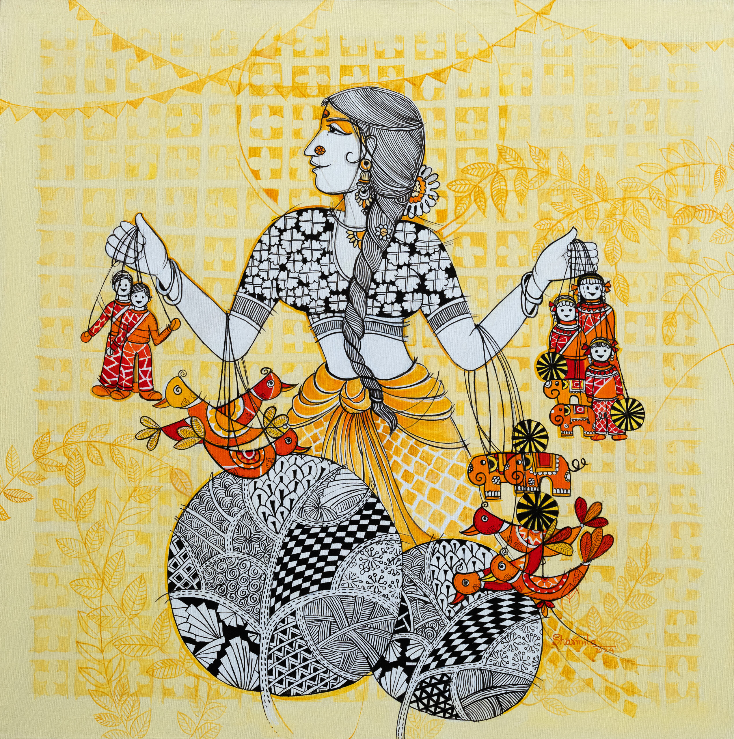 Sharmila Sharma’s artwork presents intricate detailing combined with rhythmic repetition. The structured composition guides the viewer’s gaze across layered forms and contrasting accents. Textural complexity enhances depth, while controlled design ensures balance. This contemporary piece offers visual intensity suited for curated spaces.